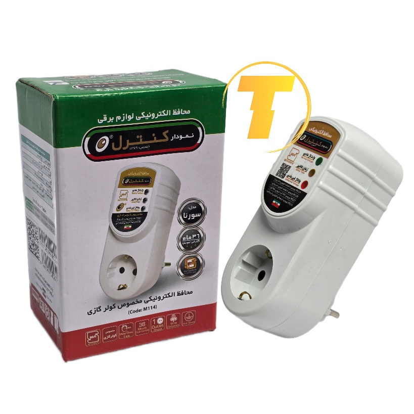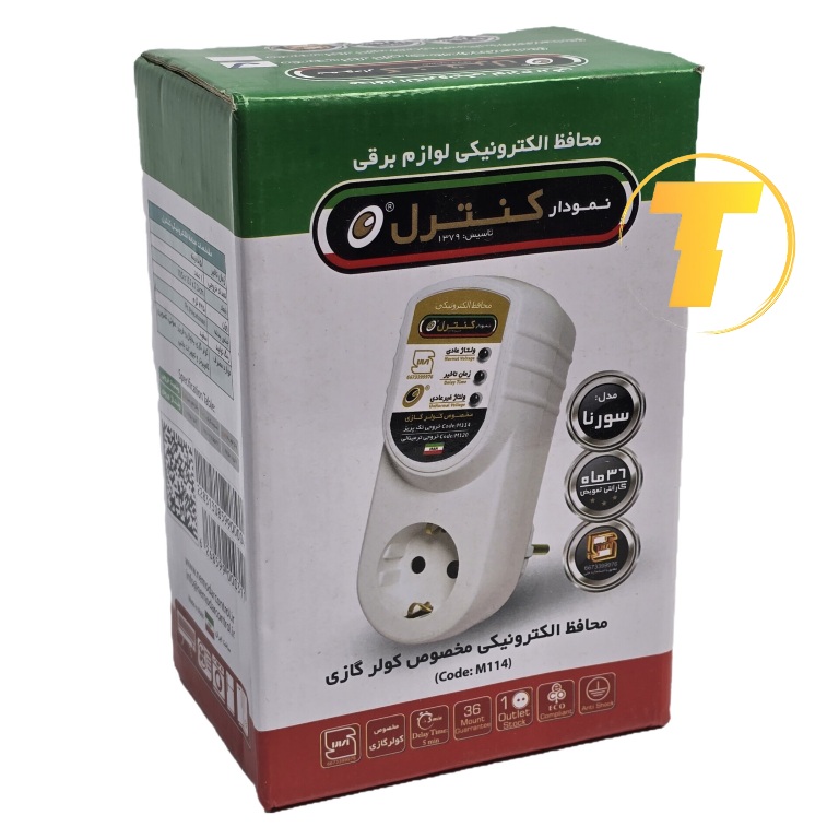 محافظ برق مخصوص کولر گازی نمودار کنترل مدل M114 سورنا دارای یک پریز می باشد. جنس بدنه محافظ M114 از پلاستیک باکیفیت ساخته شده است. این محافظ برای جلوگیری از ورود نوسانات ناشی از برق شهر و رعد و برق بر روی خطوط شیکه برق به دستگاه شما میباشد. این محافظ دارای سه نشانگر ال ای دی میباشد که هر نشانگر دارای عملکرد زیر میباشد: 1- نشانگر ال ای دی سبز هنگام وصل خروجی روشن می شود. 2- نشانگر ال ای دی نارنجی در هنگام تایم تا وصل خروجی روشن میشود. 3- نشانگر ال ای دی قرمز اگر ولتاژ ورودی خارج از محدوده استاندارد باشد روشن میشود. در هنگام وصل برق اگر ولتاژ در محدوده مجاز جدول باشد نشانگر ال ای دی نارنجی تا زمان تایم روشن میشود و بعد از آن خاموش و نشانگر ال ای دی سبز که نشان دهنده وصل خروجی است روشن میشود.اگر در هنگام کار محافظ، نشانگر ال ای دی قرمز روشن شود این بدان معناست که ولتاژ ورودی در محدوده غیر مجاز میباشد. اگر ولتاژ به محدوده مجاز برسد عملکرد بالا تکرار میشود. محافظ دارای یک خروجی بوده که دستگاه های دارای آداپتور نیز براحتی قابل اتصال به خروجی میباشد.