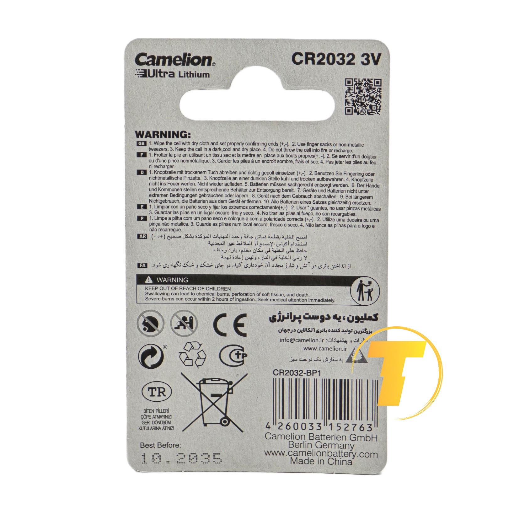 فرمت ساخت این باتری به صورت سکهای (Coin Cell) بوده و با کد استاندارد CR2032 تولید شده است؛ عدد 20 نشاندهنده قطر تقریبی 20 میلیمتر و عدد 32 بیانگر ضخامت حدود 3.2 میلیمتر است. این ابعاد استاندارد باعث میشود در تمامی دستگاههایی که از باتری CR2032 پشتیبانی میکنند، بهدرستی نصب و استفاده شود.