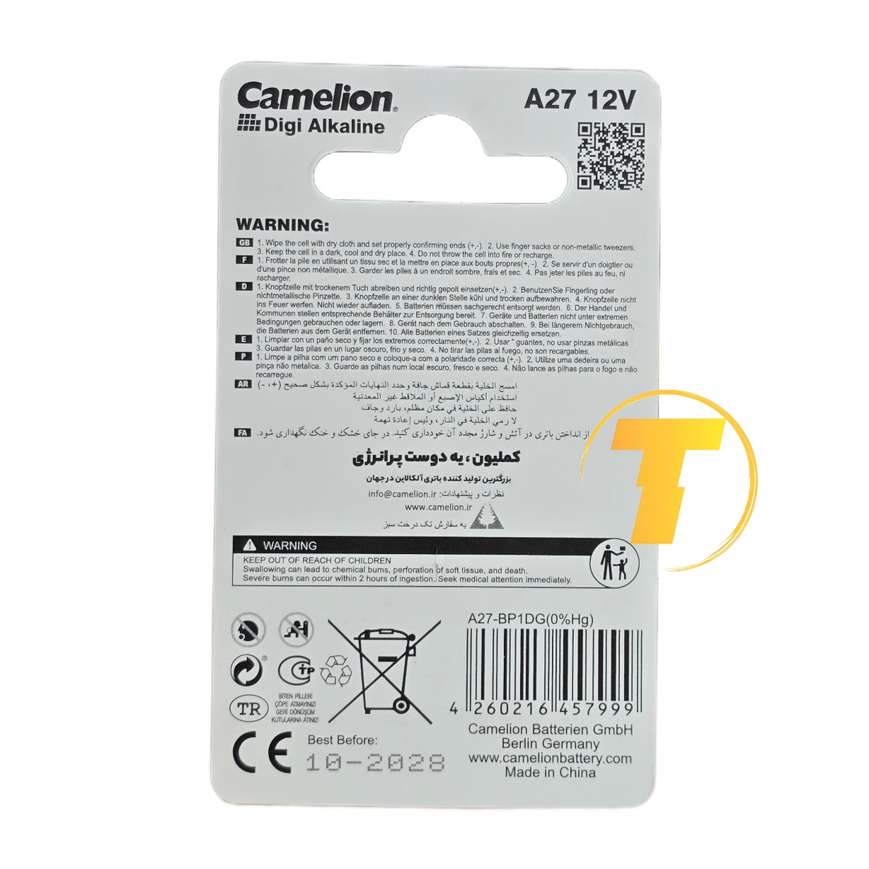 باتری ریموتی کملیون مدل A27-BP1DG با ولتاژ 12 ولت، ساختار آلکالاین و تولید بدون جیوه و کادمیم، انتخابی مناسب برای تأمین انرژی تجهیزات کوچک الکترونیکی است که به توان پایدار و ابعاد فشرده نیاز دارند.