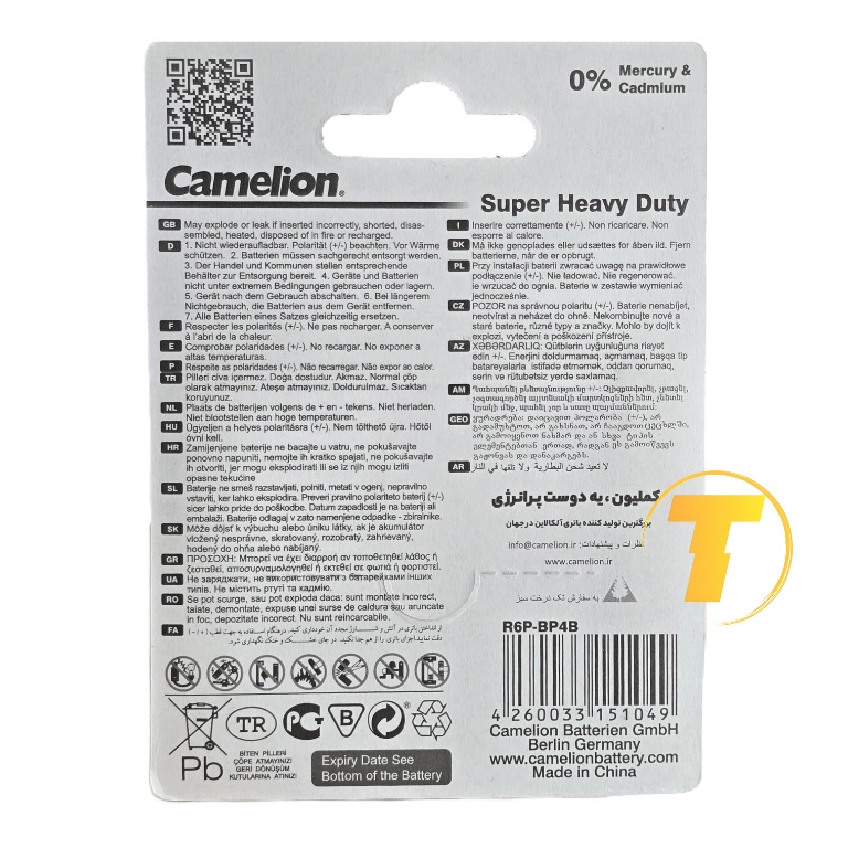 این باتری با کد R6P و استاندارد UM4 شناخته میشود که هر دو به سایز AA اشاره دارند. استفاده از فناوری بدون جیوه و کادمیم در ساخت این محصول، آن را به گزینهای ایمنتر از نظر زیستمحیطی تبدیل کرده است. عدم استفاده از فلزات سنگین مضر، علاوه بر کاهش آسیبهای محیطی، ایمنی بیشتری در زمان نگهداری و استفاده فراهم میکند.